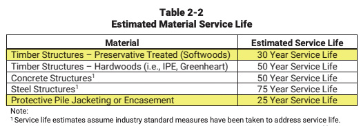 - Jacketing to repair eroded piles, either Fiberglas or PVC, plus epoxy or concrete grout, are warrantied for 25-30 years but are expected to last 50 years or more. Jacketed piles are guaranteed to be twice as strong as the original. All pilings below the mudline are in the anaerobic zone and not subject to decay, so all repairs have to extend down to the still solid portions.